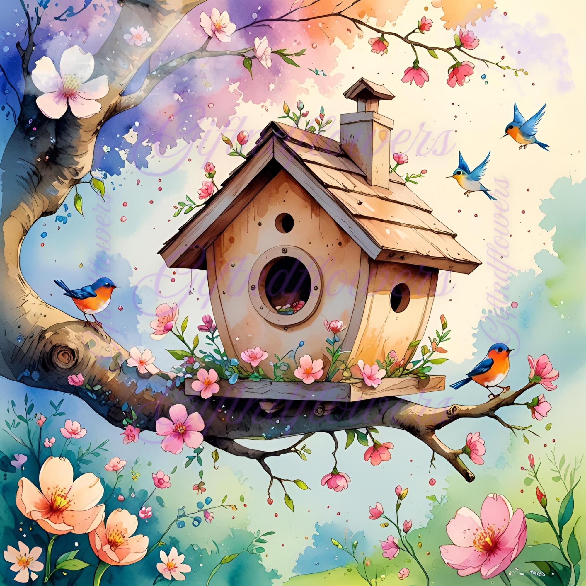 Bring a touch of nature’s serenity to your creative projects with this Birdhouse in Garden Watercolor Clipart Bundle. This charming collection features 6 high-resolution PNG images of a cozy birdhouse nestled among blooming branches, with delicate birds fluttering nearby in a lush spring garden. Perfect for garden-themed crafts, nursery art, greeting cards, and more!